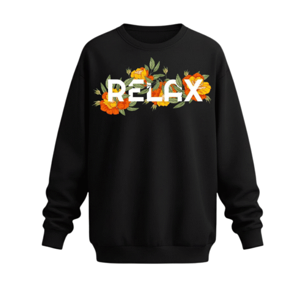 • The Concept: The front features a clean, block-letter “RELAX” graphic intertwined with vibrant orange floral accents—a subtle nod to the tranquility of nature.