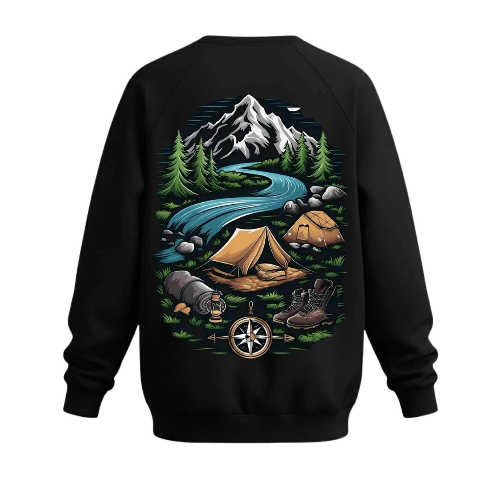 • The Artwork: The back showcases a stunning, hand-drawn style illustration of a high-altitude basecamp. From the snow-capped peaks and winding river to the detailed camping gear and vintage compass, every element is designed to spark your wanderlust.